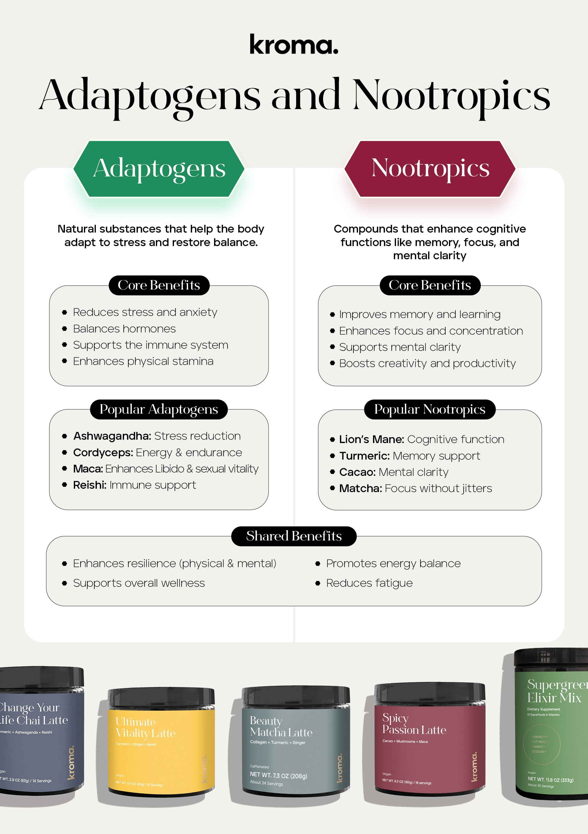Here’s the thing: it’s not really about whether adaptogens are “better” than nootropics. It’s about figuring out your wellness objectives and which plant, mushroom, or supplement in each category might best support you in reaching those goals.